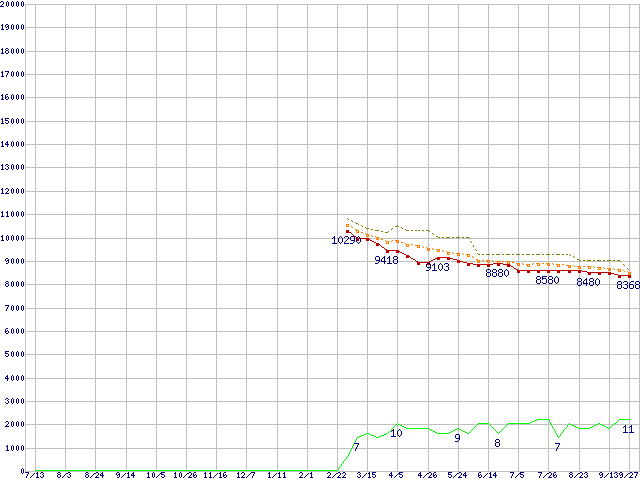 ※このグラフは過去のデータも税率5%相当に調整した税込み相当額のグラフです。 税率変更や、総額表示方式導入(2004年4月)の影響は除いています。 | | | ●凡例 | 最安値 (点線部は販売店未確認 または未調査) | 平均値 | 最高値 | ショップ数 |