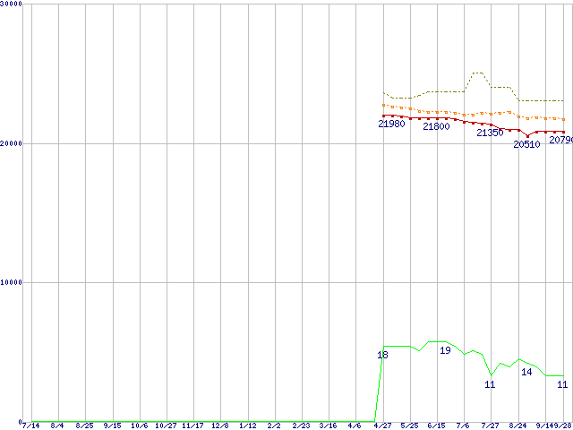 ※このグラフは過去のデータも税率5%相当に調整した税込み相当額のグラフです。 税率変更や、総額表示方式導入(2004年4月)の影響は除いています。 | | | ●凡例 | 最安値 (点線部は販売店未確認 または未調査) | 平均値 | 最高値 | ショップ数 |