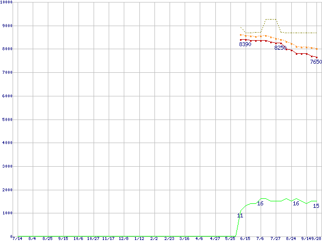 ※このグラフは過去のデータも税率5%相当に調整した税込み相当額のグラフです。 税率変更や、総額表示方式導入(2004年4月)の影響は除いています。 | | | ●凡例 | 最安値 (点線部は販売店未確認 または未調査) | 平均値 | 最高値 | ショップ数 |