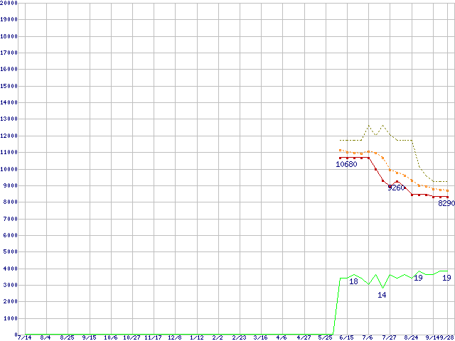 ※このグラフは過去のデータも税率5%相当に調整した税込み相当額のグラフです。 税率変更や、総額表示方式導入(2004年4月)の影響は除いています。 | | | ●凡例 | 最安値 (点線部は販売店未確認 または未調査) | 平均値 | 最高値 | ショップ数 |