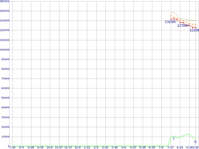 ※このグラフは過去のデータも税率5%相当に調整した税込み相当額のグラフです。 税率変更や、総額表示方式導入(2004年4月)の影響は除いています。 | | | ●凡例 | 最安値 (点線部は販売店未確認 または未調査) | 平均値 | 最高値 | ショップ数 |