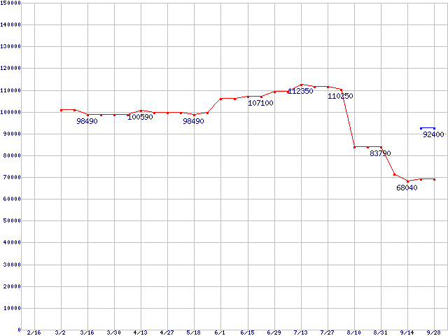 | Socket F (FSB 1000MHz,L2 1MBx2,Dual Core,TDP 95W)の最安値推移 | | | (2007年2月16日~2007年9月28日) |