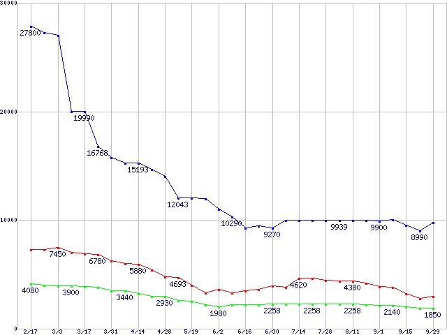 PC2-6400(DDR2-800) DDR2 SDRAM DIMMの最安値推移