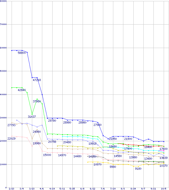 | CPU主要製品(最安値1万円~2万円未満)の最安値推移 | | | (2007年2月23日~2007年10月5日) |