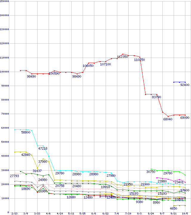 | AMD系CPUの最安値推移 | | | (2007年2月23日~2007年10月5日) |