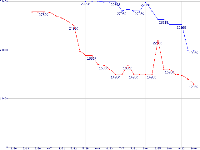 メモリ主要製品(最安値1万円以上)の最安値推移