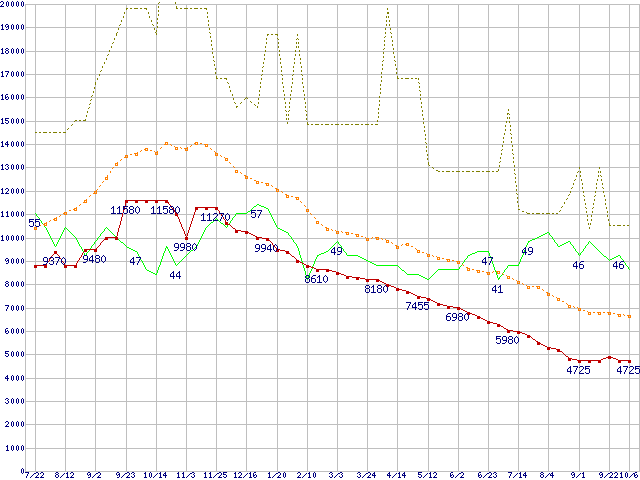 ※このグラフは過去のデータも税率5%相当に調整した税込み相当額のグラフです。 税率変更や、総額表示方式導入(2004年4月)の影響は除いています。 | | | ●凡例 | 最安値 (点線部は販売店未確認 または未調査) | 平均値 | 最高値 | ショップ数 |