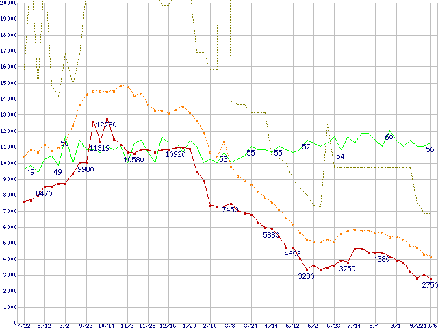 ※このグラフは過去のデータも税率5%相当に調整した税込み相当額のグラフです。 税率変更や、総額表示方式導入(2004年4月)の影響は除いています。 | | | ●凡例 | 最安値 (点線部は販売店未確認 または未調査) | 平均値 | 最高値 | ショップ数 |
