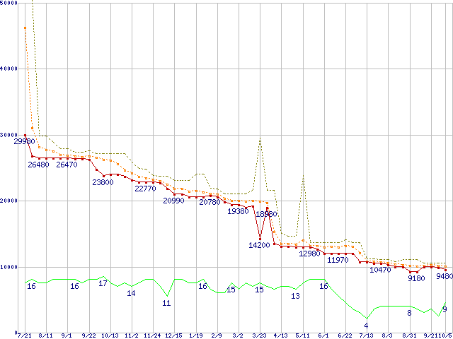※このグラフは過去のデータも税率5%相当に調整した税込み相当額のグラフです。 税率変更や、総額表示方式導入(2004年4月)の影響は除いています。 | | | ●凡例 | 最安値 (点線部は販売店未確認 または未調査) | 平均値 | 最高値 | ショップ数 |