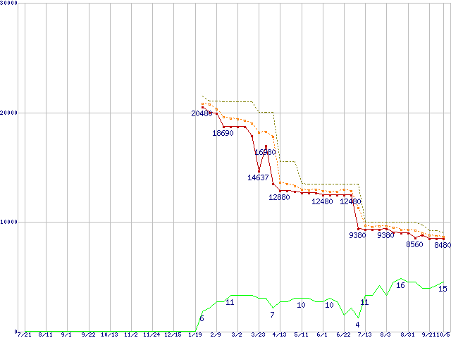 ※このグラフは過去のデータも税率5%相当に調整した税込み相当額のグラフです。 税率変更や、総額表示方式導入(2004年4月)の影響は除いています。 | | | ●凡例 | 最安値 (点線部は販売店未確認 または未調査) | 平均値 | 最高値 | ショップ数 |