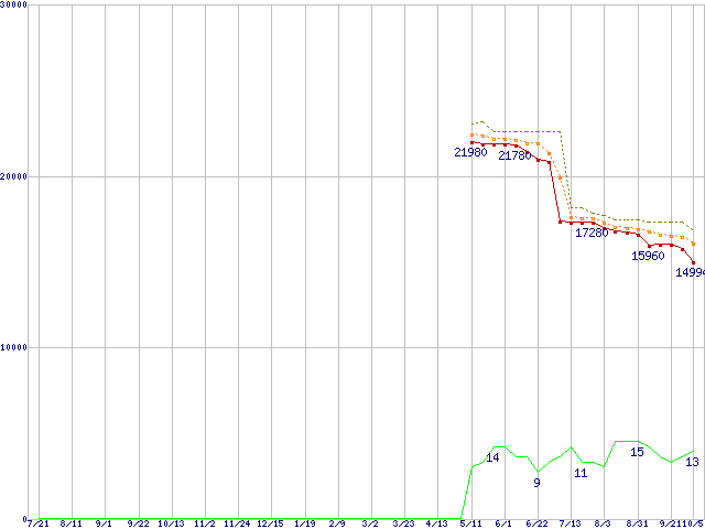 ※このグラフは過去のデータも税率5%相当に調整した税込み相当額のグラフです。 税率変更や、総額表示方式導入(2004年4月)の影響は除いています。 | | | ●凡例 | 最安値 (点線部は販売店未確認 または未調査) | 平均値 | 最高値 | ショップ数 |