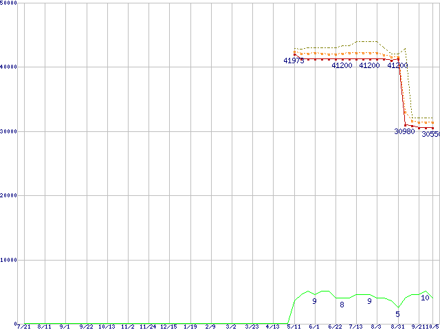 | Core 2 Duo T7500 (2.2GHz,L2 4MB)の価格推移 | | | (2006年7月21日~2007年10月5日) |