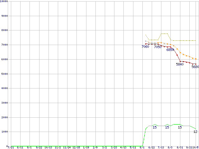 ※このグラフは過去のデータも税率5%相当に調整した税込み相当額のグラフです。 税率変更や、総額表示方式導入(2004年4月)の影響は除いています。 | | | ●凡例 | 最安値 (点線部は販売店未確認 または未調査) | 平均値 | 最高値 | ショップ数 |