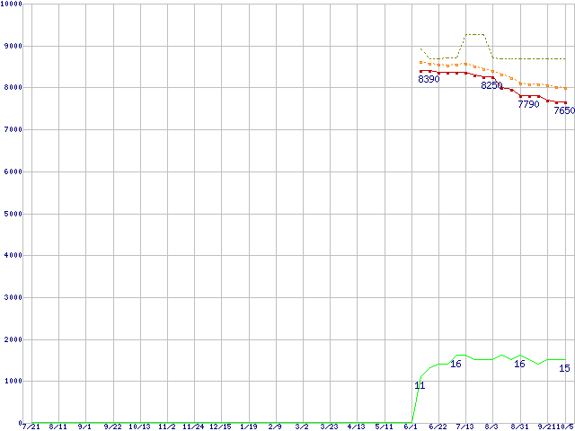 ※このグラフは過去のデータも税率5%相当に調整した税込み相当額のグラフです。 税率変更や、総額表示方式導入(2004年4月)の影響は除いています。 | | | ●凡例 | 最安値 (点線部は販売店未確認 または未調査) | 平均値 | 最高値 | ショップ数 |