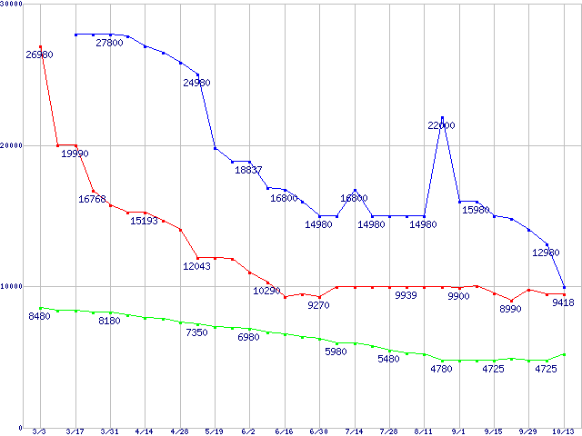 メモリ主要製品(最安値1万円以上)の最安値推移