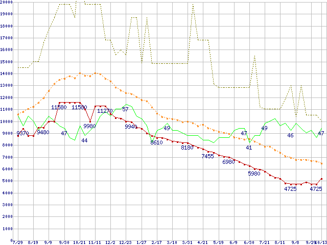 ※このグラフは過去のデータも税率5%相当に調整した税込み相当額のグラフです。 税率変更や、総額表示方式導入(2004年4月)の影響は除いています。 | | | ●凡例 | 最安値 (点線部は販売店未確認 または未調査) | 平均値 | 最高値 | ショップ数 |