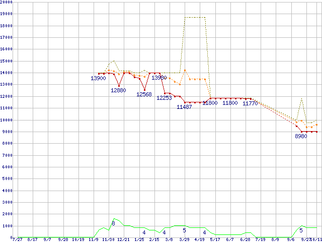 ※このグラフは過去のデータも税率5%相当に調整した税込み相当額のグラフです。 税率変更や、総額表示方式導入(2004年4月)の影響は除いています。 | | | ●凡例 | 最安値 (点線部は販売店未確認 または未調査) | 平均値 | 最高値 | ショップ数 |