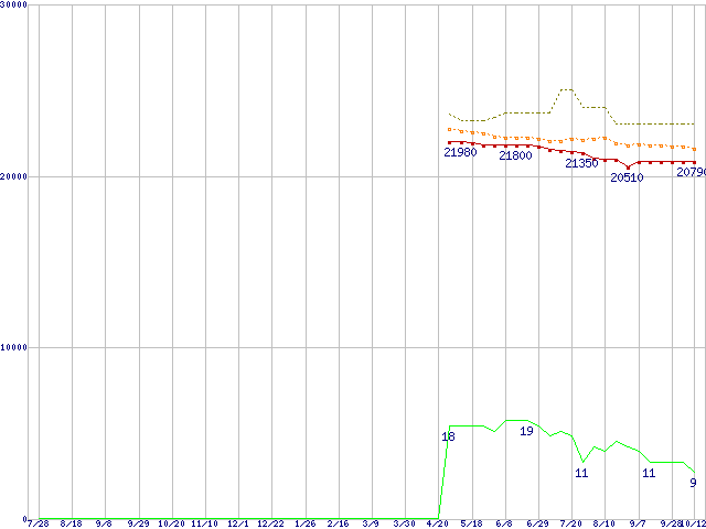 ※このグラフは過去のデータも税率5%相当に調整した税込み相当額のグラフです。 税率変更や、総額表示方式導入(2004年4月)の影響は除いています。 | | | ●凡例 | 最安値 (点線部は販売店未確認 または未調査) | 平均値 | 最高値 | ショップ数 |