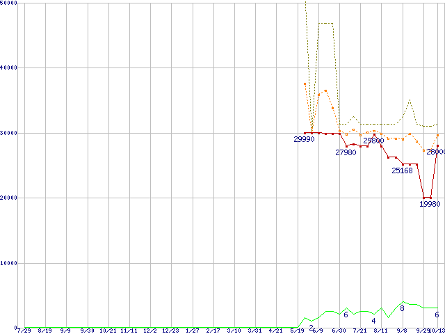 ※このグラフは過去のデータも税率5%相当に調整した税込み相当額のグラフです。 税率変更や、総額表示方式導入(2004年4月)の影響は除いています。 | | | ●凡例 | 最安値 (点線部は販売店未確認 または未調査) | 平均値 | 最高値 | ショップ数 |
