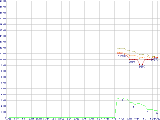 ※このグラフは過去のデータも税率5%相当に調整した税込み相当額のグラフです。 税率変更や、総額表示方式導入(2004年4月)の影響は除いています。 | | | ●凡例 | 最安値 (点線部は販売店未確認 または未調査) | 平均値 | 最高値 | ショップ数 |