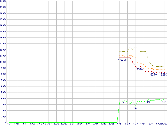 ※このグラフは過去のデータも税率5%相当に調整した税込み相当額のグラフです。 税率変更や、総額表示方式導入(2004年4月)の影響は除いています。 | | | ●凡例 | 最安値 (点線部は販売店未確認 または未調査) | 平均値 | 最高値 | ショップ数 |