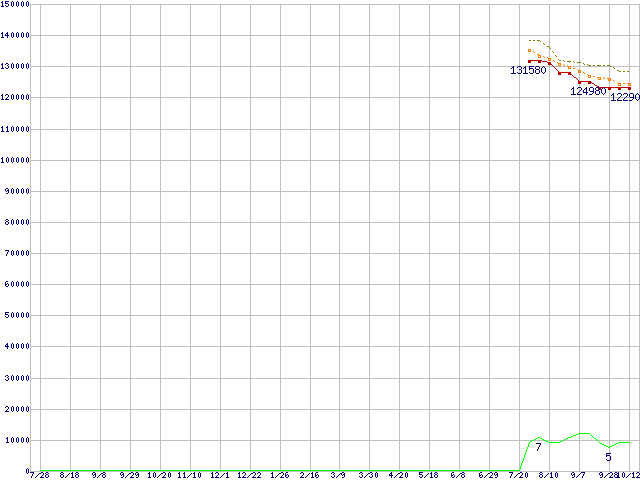 ※このグラフは過去のデータも税率5%相当に調整した税込み相当額のグラフです。 税率変更や、総額表示方式導入(2004年4月)の影響は除いています。 | | | ●凡例 | 最安値 (点線部は販売店未確認 または未調査) | 平均値 | 最高値 | ショップ数 |