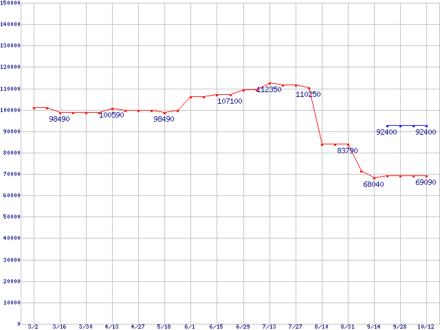 | Socket F (FSB 1000MHz,L2 1MBx2,Dual Core,TDP 95W)の最安値推移 | | | (2007年3月2日~2007年10月12日) |