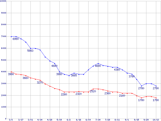 PC2-4200*(DDR2-533) DDR2 SDRAM DIMMの最安値推移