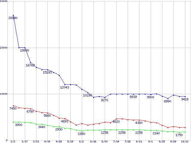 PC2-6400(DDR2-800) DDR2 SDRAM DIMMの最安値推移