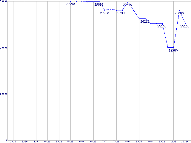| メモリ主要製品(最安値1万円以上)の最安値推移 | | | (2007年3月10日~2007年10月20日) |