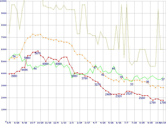 ※このグラフは過去のデータも税率5%相当に調整した税込み相当額のグラフです。 税率変更や、総額表示方式導入(2004年4月)の影響は除いています。 | | | ●凡例 | 最安値 (点線部は販売店未確認 または未調査) | 平均値 | 最高値 | ショップ数 |