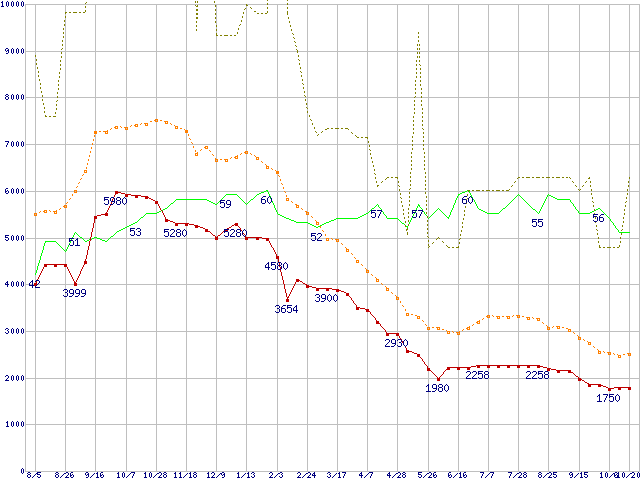 ※このグラフは過去のデータも税率5%相当に調整した税込み相当額のグラフです。 税率変更や、総額表示方式導入(2004年4月)の影響は除いています。 | | | ●凡例 | 最安値 (点線部は販売店未確認 または未調査) | 平均値 | 最高値 | ショップ数 |