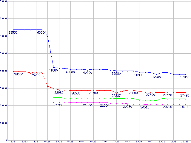 | LGA775 (FSB 1066MHz,Dual Core,EM64T対応,TDP 65W)の最安値推移 | | | (2007年3月9日~2007年10月19日) |