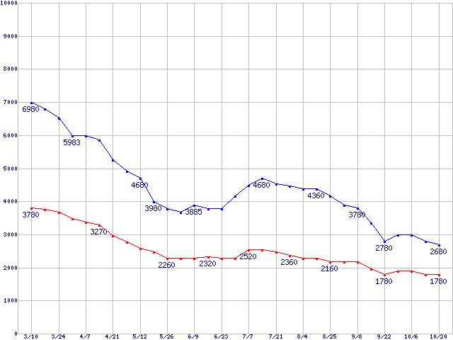 PC2-4200*(DDR2-533) DDR2 SDRAM DIMMの最安値推移