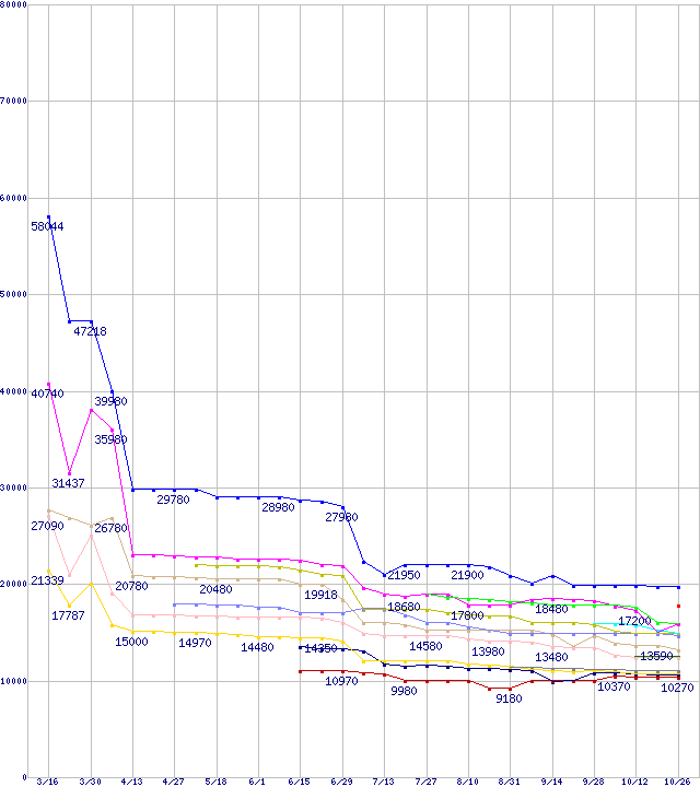 | CPU主要製品(最安値1万円~2万円未満)の最安値推移 | | | (2007年3月16日~2007年10月26日) |