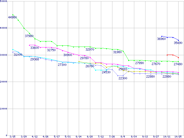 HDD 500~750GB未満の最安値推移