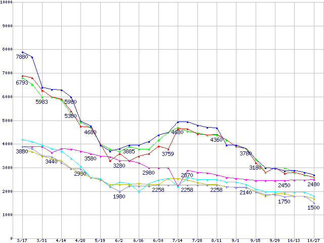 メモリ主要製品(最安値5千円~1万円未満)の最安値推移
