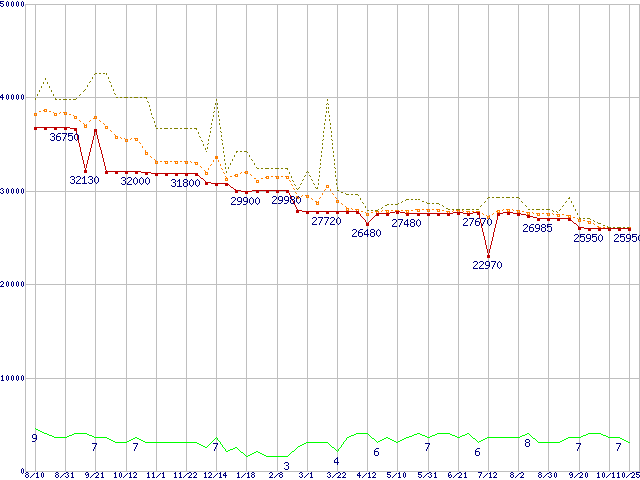 ※このグラフは過去のデータも税率5%相当に調整した税込み相当額のグラフです。 税率変更や、総額表示方式導入(2004年4月)の影響は除いています。 | | | ●凡例 | 最安値 (点線部は販売店未確認 または未調査) | 平均値 | 最高値 | ショップ数 |