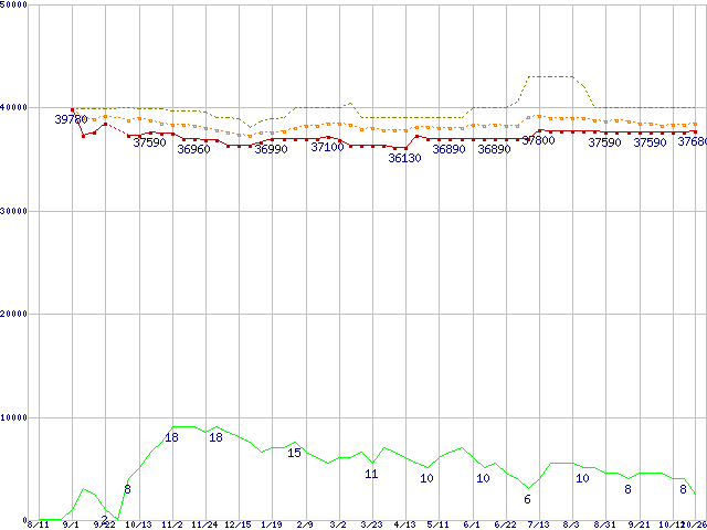 | Core 2 Duo T7200 (2.00GHz,L2 4MB)の価格推移 | | | (2006年8月11日~2007年10月26日) |