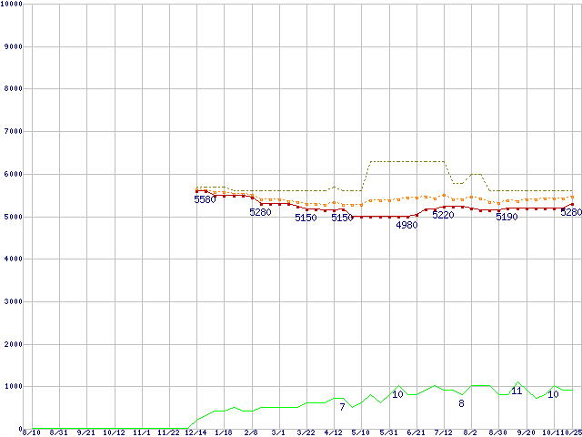 ※このグラフは過去のデータも税率5%相当に調整した税込み相当額のグラフです。 税率変更や、総額表示方式導入(2004年4月)の影響は除いています。 | | | ●凡例 | 最安値 (点線部は販売店未確認 または未調査) | 平均値 | 最高値 | ショップ数 |