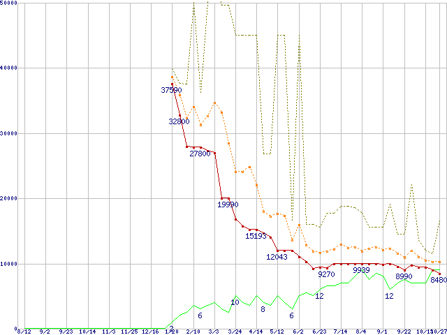 ※このグラフは過去のデータも税率5%相当に調整した税込み相当額のグラフです。 税率変更や、総額表示方式導入(2004年4月)の影響は除いています。 | | | ●凡例 | 最安値 (点線部は販売店未確認 または未調査) | 平均値 | 最高値 | ショップ数 |