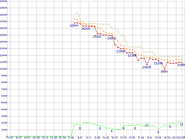 ※このグラフは過去のデータも税率5%相当に調整した税込み相当額のグラフです。 税率変更や、総額表示方式導入(2004年4月)の影響は除いています。 | | | ●凡例 | 最安値 (点線部は販売店未確認 または未調査) | 平均値 | 最高値 | ショップ数 |
