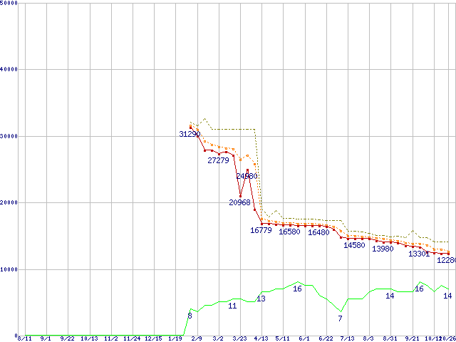 ※このグラフは過去のデータも税率5%相当に調整した税込み相当額のグラフです。 税率変更や、総額表示方式導入(2004年4月)の影響は除いています。 | | | ●凡例 | 最安値 (点線部は販売店未確認 または未調査) | 平均値 | 最高値 | ショップ数 |