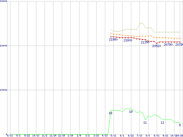 ※このグラフは過去のデータも税率5%相当に調整した税込み相当額のグラフです。 税率変更や、総額表示方式導入(2004年4月)の影響は除いています。 | | | ●凡例 | 最安値 (点線部は販売店未確認 または未調査) | 平均値 | 最高値 | ショップ数 |