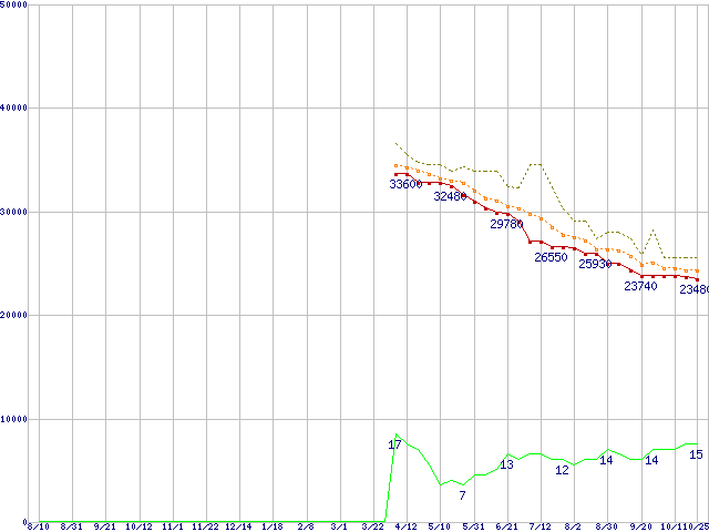 ※このグラフは過去のデータも税率5%相当に調整した税込み相当額のグラフです。 税率変更や、総額表示方式導入(2004年4月)の影響は除いています。 | | | ●凡例 | 最安値 (点線部は販売店未確認 または未調査) | 平均値 | 最高値 | ショップ数 |