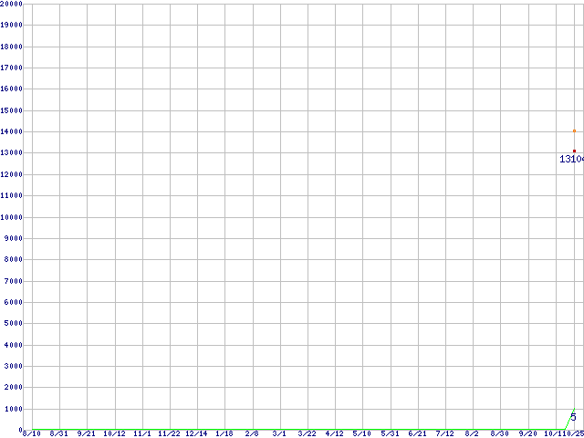 ※このグラフは過去のデータも税率5%相当に調整した税込み相当額のグラフです。 税率変更や、総額表示方式導入(2004年4月)の影響は除いています。 | | | ●凡例 | 最安値 (点線部は販売店未確認 または未調査) | 平均値 | 最高値 | ショップ数 |
