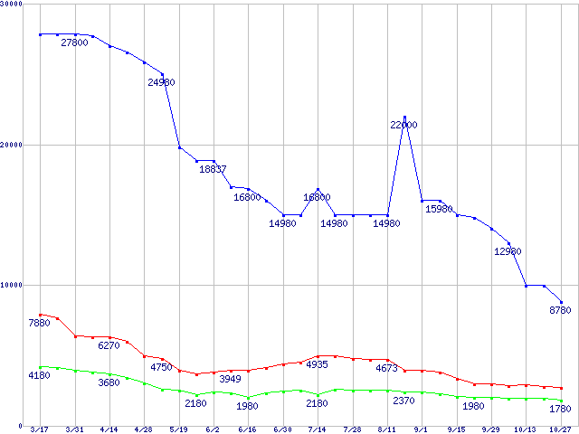 PC2-6400(DDR2-800) DDR2 SDRAM DIMMの最安値推移