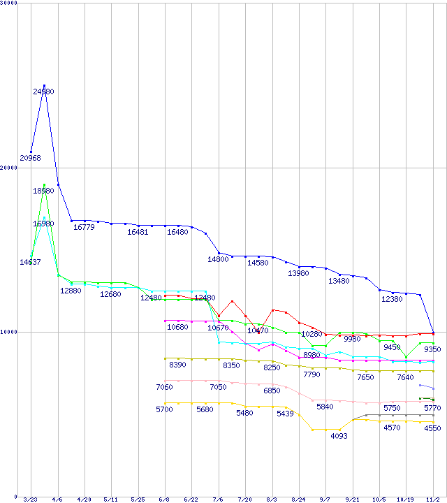 | CPU主要製品(最安値1万円未満)の最安値推移 | | | (2007年3月23日~2007年11月2日) |