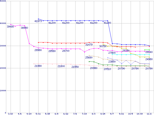 | CPU主要製品(最安値2万円~3万円未満)の最安値推移 | | | (2007年3月23日~2007年11月2日) |