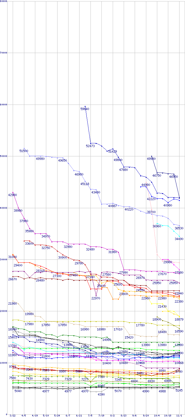 [前グラフ]:HDD主要製品の最安値推移